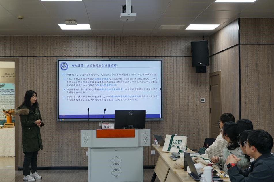2021级金融学博士生张进平分享了关于“Robust Dynamic Trading with Realization Utility”的报告,文章模型通过将不确定性纳入跨期实现效用模型,发现不确定性侵蚀了投资者的价值,使其更愿意承担风险,模型不确定性加速了销售,从而缩短了平均持有期,加强了处置效应。2024级金融学硕士生王梦涵做了关于“宏观经济信息发布与市场信息效率”的报告,论文发现宏观经济信息发布提高了盈余公告信息吸收效率,在宏观经济信息发布日发布的盈余公告股价即时反应增加,而后续的价格漂移减弱。2022级金融学博士生赵浩权分享了关于“不确定性、自动化投资与技能溢价——基于企业资本结构优化的视角”的报告,文章引入了智能资本投资与自动化的DSGE模型。研究自动化对劳动力的替代作用以及智能资本对传统资本投资的替代作用,并基于2007-2022年中国制造业上市公司数据进行了实证检验。2022级金融学博士生李媛媛做了关于“期保联动与农户致贫返贫风险——基于CHFS的微观证据”的报告,文章发现期保联动试点显著降低了农户致贫返贫风险。期保联动试点会通过缓解农户的外部约束,提高农业保险的可得性和利用率,并通过提高农户金融认知以及农业生产积极性产生内部激励效应,从而降低致贫返贫风险。