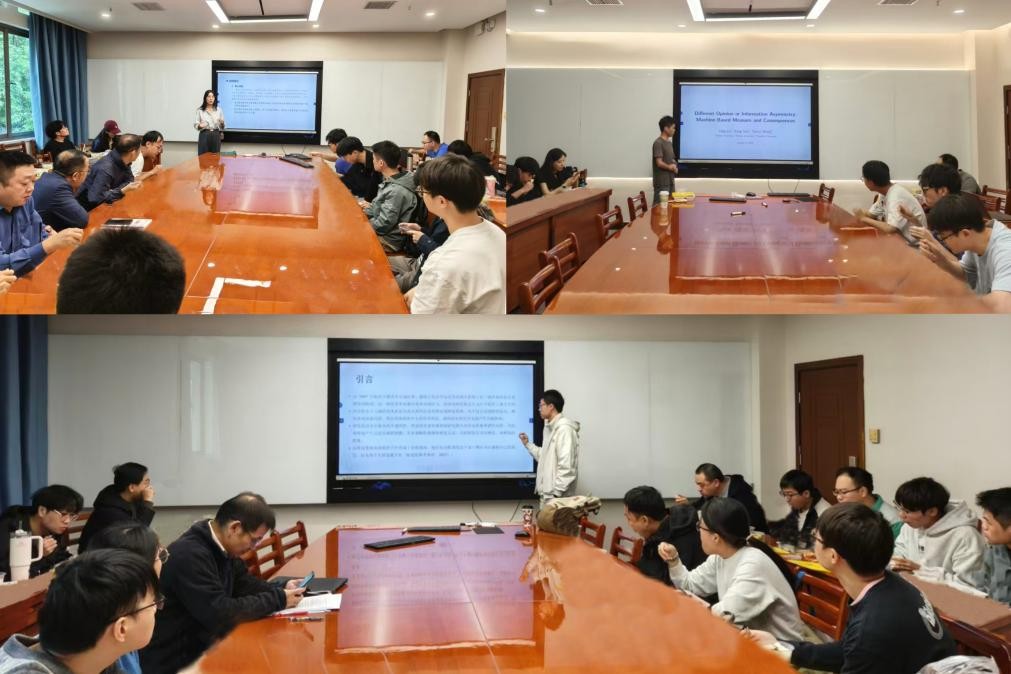 第二期活动于2025年10月9日举行,由2025级金融工程博士郭康主讲,报告题目为《Different Opinion or Information Asymmetry: Machine-Based Measure and Consequences》。报告创新性地运用机器学习方法测度了两种不同来源的信念分歧,并发现它们对市场流动性和横截面收益产生了截然不同的影响。研究进一步从信息不对称、过度外推信念以及投资者预期偏差等角度深入挖掘了背后的驱动因素。报告期间,评审专家就研究动机、投资者信念与预期的概念区分、以及信念分歧的来源等问题进行了深入点评。2024级金融学博士生张竞心担任互评人。在场师生围绕指标测度方法、理论机制等关键问题展开了深入探讨。