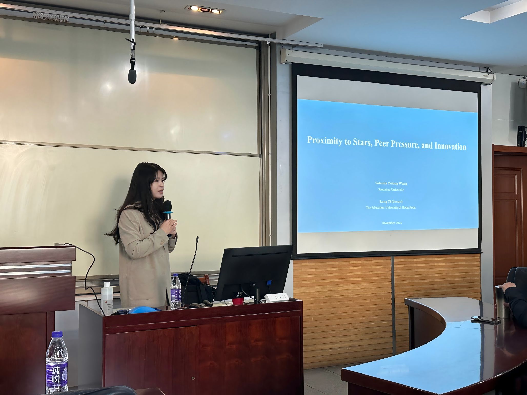 2025年12月1日下午,一场聚焦企业创新的学术沙龙在学院210成功举行。本次论坛邀请了深圳大学王玉龙教授进行题为Proximity to Stars, Peer Pressure, and Innovation(与明星企业的接近度、同侪压力与创新)的学术报告。讲座深入探讨了地理集聚如何通过“压力”而非单纯的“学习”来驱动企业创新。学院多位教师、硕士、博士研究生参会。