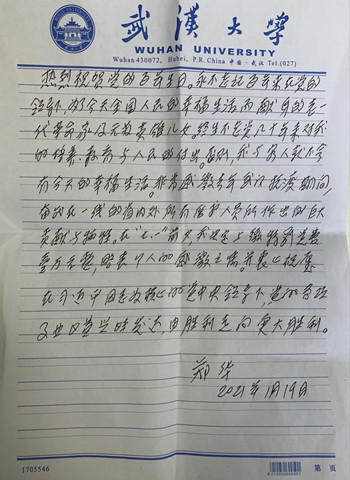 2021年1月19日上午,学院党委副书记李好、院老协秘书长姜文两位同志,前往离休教授郑华家中进行老党员和离退休老师春节慰问。刚进门坐下,郑华就取出事先准备好的1万元现金,并郑重地说:“我是1953年加入中国共产党,没有共产党就没有我和家人今天的幸福生活。今年是建党100周年,请你们代我转交给党组织,以表达我对党组织培养和教育的感激之情……”简单淳朴的话语,折射着老人对党的忠诚和挚爱,也彰显着一名老党员知党情、报党恩的朴素情怀。