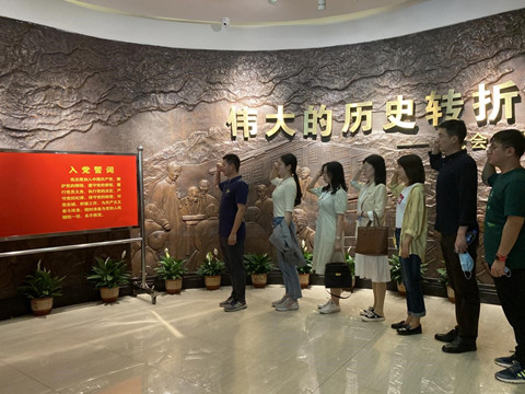 步入正厅,“伟大的历史转折”几个大字清晰地展现在眼前,背景的雕刻生动再现了当时的会议场景。支部成员在熊壮同志的带领之下,举起右手,重温入党誓词。在纪念馆严肃的背景中,在重温入党誓词的过程中,党员们再一次坚定了理想信念,增强了使命感与责任感。