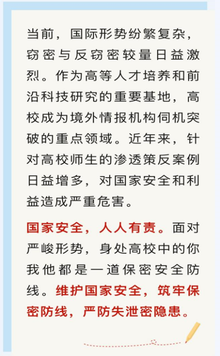 随后,支部党员重温了《谨防校园泄密风险,共筑国家安全防线》。面对纷繁复杂的国际形势、日益激烈的窃密与反窃密较量,四个典型案例给高校师生从不同方面作出保密提醒。在保密学习教育活动中,杨玲重点介绍了校园保密的五个须知:“上网不涉密,涉密不上网”、”手机不传密,心中莫侥幸”、“社交有分寸,聊天勿泄密”、“求职应警惕,严防窃密敌”、“涉外须谨慎,内外应有别”。作为高校教师,在日常教学和科研中尤其要做到维护国家安全,筑牢保密防线,严防失泄密隐患。
