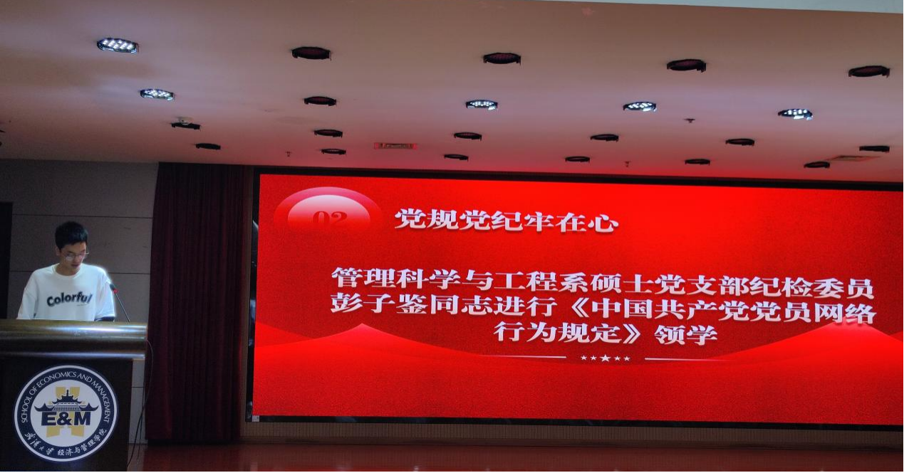 理论学习环节,硕士党支部纪检委员 彭子鉴 同志领学《中国共产党党员网络行为规定》,明确党员在网络空间应严守纪律、传播正能量。管工系教师党支部书记 陈植元 老师对《中国共产党党徽党旗条例》进行领学和深入解读,强调师生党员自觉维护党的象征和标志,筑牢思想根基。党员同志们纷纷表示,要进一步增强党性修养,把党章党规党纪作为党性修养的重要内容,用党的创新理论铸魂固本,常补精神之钙,常筑思想堤坝,发挥先锋模范作用,勇于担当作为。