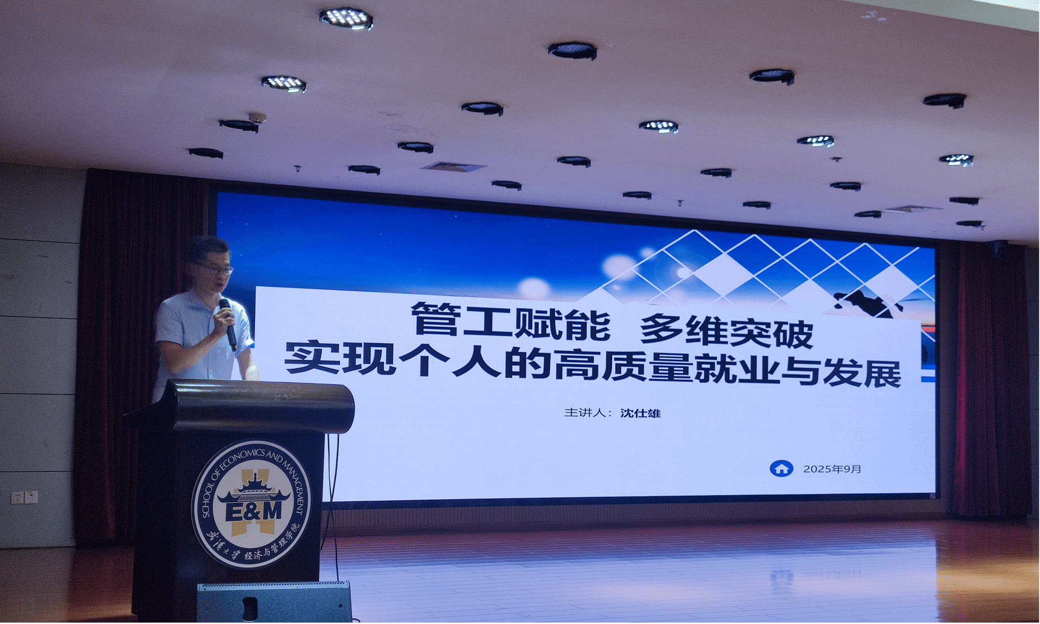 研究生工作办公室主任 沈仕雄 老师以“管工赋能 多维突破——实现个人的高质量就业与发展”为主题作总结发言。学习抗战精神,牢记历史,是为了未来更加奋发图强。回顾2025年,管工系硕博士就业率落实100%,就业质量佳,交出了管工学子优异答卷。老师进一步结合专业特点与学生发展需求,阐述了如何在自身研究领域实现个人价值与社会贡献的统一,鼓励同学们将抗战精神内化为源源不断的磅礴力量,外化为攻坚克难、追求卓越的实际行动,勇担责任,将个人理想追求融入国家大事业中。
