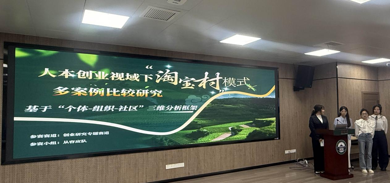 获得第二名的队伍“从容应队”由弘毅学堂的陶可谦担任队长,成员包括来自弘毅学堂的孙皎雨、聂雯钧、聂瑞冰和卢欣然。团队聚焦人本创业理念,以淘宝村为研究对象,构建了“个体-组织-社区”三维分析框架,通过对山东曹县、江苏沙集、浙江遂昌三个典型案例的深入比较,系统阐释了不同驱动模式下淘宝村如何实现个体赋能、组织共生与社区融合的协同发展。不仅从理论层面深化了人本创业在乡村情境下的本土化建构,更从实践层面为乡村振兴提供了差异化的路径参考,助力实现经济效益与社会价值的平衡。团队认为创业不仅是商业行为,更关乎人的发展与社区的振兴,坚定了以人为中心、以可持续为导向的创业理念。