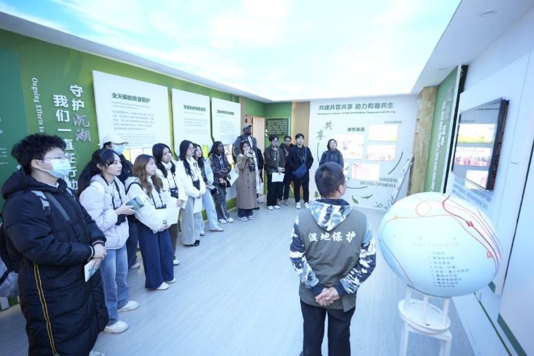 “沉湖湿地不仅是鸟类的家园,更是全球生态治理的生动样本。”郭凛老师介绍,“选择在这里开展国际交流,是因为沉湖的国际地位和其在全球生态保护议题中的独特价值。这里不仅是自然的宝库,更是国际商务与可持续发展对话的理想场所。”