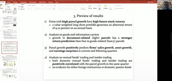 2021年1月5日下午,珞珈经管高端论坛第二十六期通过腾讯会议在线举行。此次论坛主讲人为香港中文大学(深圳)经管学院张博辉教授,论坛主题为“Does Express Delivery Run ahead of Stock Price?”(特快专递走在股价之前吗?)。本次讲座由金融系和AV淘宝