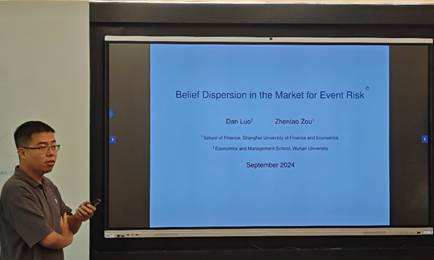 邹镇涛老师带来了主题为“Belief Dispersion in the Market for Event Risk”的报告。在邹老师提出的信念分散模型中,个体间对罕见事件发生概率的信念不一致,并且构成了一个连续的分布。尽管跳跃的真实概率保持不变,但是由于其不可观测,从而个体间信念的不一致会放大股票价格的跳跃幅度,并且股票期权的自激励跳跃风险会被定价。跳跃风险溢价显示逆周期变化。此外模型结果还指出信念离散度与罕见事件风险保险市场规模之间存在倒U形关系,即在个体间信念差异足够大时,过高风险溢价会降低个体参与保险市场交易的动机。
