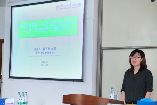 南开大学金融学院段月姣教授报告主题为“民国商业银行、资产配置与战后恢复”。她指出,中国商业银行的诞生与公债发行密切相关,商业银行在为政府解决财政问题同时,面临资产端大量债券、贷款主要面向股东企业的困境。段教授运用双重差分(DID)法,分析商业银行在北伐战争冲击下的恢复能力。研究结果表明,银行资产配置有价证券占比高的银行战后盈利下降,银行规模对盈利影响并不稳定。研究为理解国家主权信用发生冲击的时候,传统无风险资产发挥的作用提供了新的视角,并突出了资产端的流动性与风险问题。