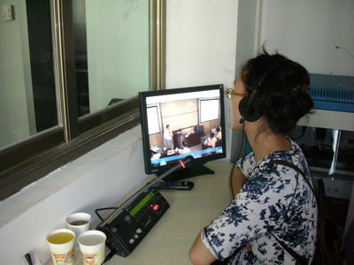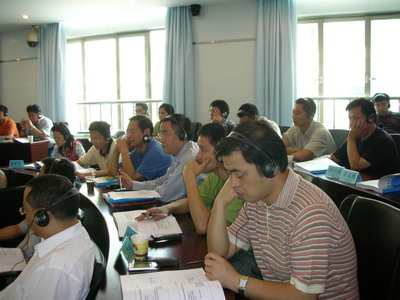 同声传译是一套利用红外线送出声音的无线传输设备,能保证在有限的教学时间内实现课程内容的最大化。在用于现场工作时,授课人的声音信号通过设备总控制台输入,译员们坐在隔音传译室内,带着耳机收听原始声音,与此同时,译员采用另一种语言进行同声翻译。学员使用接收器接收红外光信号形式传输的信息,在接收器上连上耳机,就可以选择收听授课人的声音或者同步收听控制台发射出来的翻译语言,通过频段的调换,可以任意收听到三类完全不同语种的翻译语言。