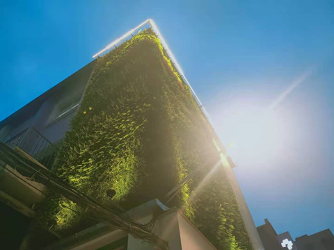 植物墙是用绿色植物编植成的墙体,是利用植物的根系对生长环境的超强自适应能力,使自然界中栖息于平地上的植物生长于垂直的建筑墙面。植物墙为建筑设计和建筑装饰提供了一种新型的有机生态材料。利用植物代替砖、石、钢筋水泥来砌墙,不仅占地面积少,省料省钱,而且能绿化美化环境、减少噪音、净化空气、调节温度,具有很多好处。