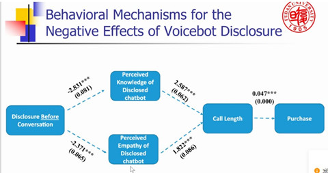 本次讲座,屈锗教授介绍了题为“AI Voicebot in Sales Call Automation”(销售自动化中的AI语音机器人)的一系列研究。由于人工智能(AI)的支持,聊天机器人作为一种既有商业潜力又能吸引客户的新技术正在蓬勃发展。屈教授的第一个研究是AI语音机器人在促进消费者购买方面的应用。AI语音机器人在减少人工成本和增加沟通效果方面已经很接近人类水平。那么企业为了降低成本起见,是否可以用AI机器人取代人工服务呢?屈锗与合作者研究了AI语音机器人与人工客服在促进顾客购买方面的效果。研究结果发现,如果顾客并不知道与他们进行通话的是AI机器人,AI机器人促进购买的水平与人工客服相差无几;但是如果顾客知晓与之通话的是AI机器人,他们的购买意愿会急剧下降,因为他们认为语音机器人的知识面较低,缺乏同情心。针对这种情况,屈教授研究团队进一步提出,随着消费者与AI语音服务机器人接触的增多,他们对于语音服务机器人的抵触会显著降低。