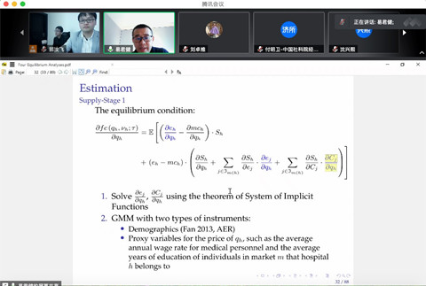 健康经济与管理研究中心执行主任郭汝飞副教授主持,吸引了七十余名师生在线参与。易君健分享的研究主题是“中国医疗市场的四个一般均衡分析”。首先,易君健构建了医疗市场的一般均衡模型,从供给和需求两方面解释了医疗保险对医疗市场均衡的影响,发现这一影响在城镇和农村地区具有很强的异质性。第二,易君健研究了医院的竞争评级体制对患者福利和政府医疗支出的均衡效果,发现医院的竞争评级会损害患者福利并增加政府医疗支出。第三,研究了医疗市场准入对患者福利的影响。最后,构建并估计了医生和患者的共同医疗决策模型。