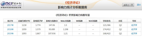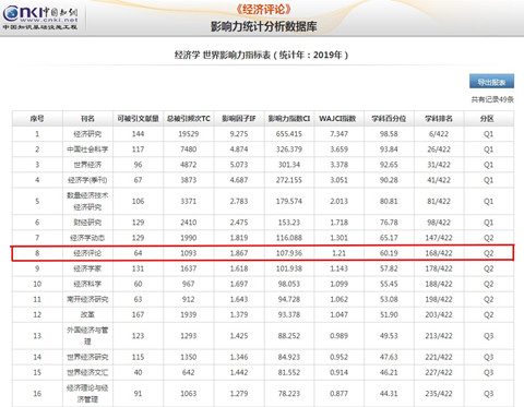 日前,由中国科学文献计量评价研究中心、《中国学术期刊(光盘版)》电子杂志社有限公司、清华大学图书馆联合研制的《世界学术期刊学术影响力指数(WAJCI)年报(2020)》最新显示,《经济评论》2019年世界学术期刊学术影响力指数(WAJCI)为1.21,总被引频次(TC)为1093,影响因子(IF)为1.867。经济学学科内WAJCI世界排名在422种期刊中位列168,居中国经济学期刊第8名,在Q2区的排名上升至第二。
