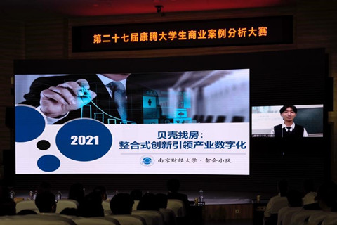 决赛由三个环节组成:自选案例展示、公选案例分析挑战、巅峰对决。在第一轮自选案例展示中,参赛队伍分别就“贝壳找房”“广联达”“菜鸟网络”“三一重工”“zoom线上办公”“安踏”“伊利”七大企业在后疫情时代如何依托数字技术进行产业转型进行了生动准确的专业分析。