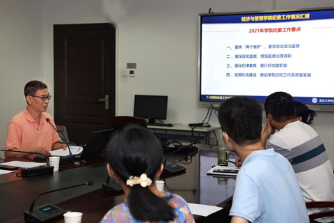 王滨通报了学院纪委上半年工作开展情况,布置了下半年纪检工作。2021年上半年,学院纪委在学校纪委和学院党委的双重领导下,围绕学院发展大局,充分发挥监督保障执行、促进完善发展作用,以全面从严治党保障学院“十四五”规划起步开局目标任务落到实处,重点开展了“突出政治监督、加强同级监督、做细做实日常监督、开展专项监督检查、畅通检举控告渠道、加强党的纪律教育、切实履行协助职能、健全纪检队伍、建强纪检队伍、推动学院高质量发展”等10项工作。王滨还通报了学校纪委2021年上半年专项监督抽查有关情况,充分发挥身边案例的警示、教育作用。王滨指出,下半年,学院纪委将在纪律教育的经常性和广泛性方面进一步加强,各支部纪检委员要担负起责任,推动纪检工作深入开展。