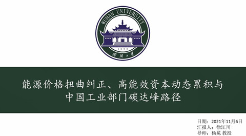 随后,杨冕教授与其指导的博士生徐江川作了题为“能源价格扭曲纠正、高能效资本动态积累与中国工业部门碳达峰路径”的报告。在深入剖析能源价格扭曲内生影响资本用能效率动力机制的基础上,通过构建增强型影子成本函数模型,量化考察能源价格扭曲对工业能耗以及碳排放的影响,并实证评估能源价格扭曲的纠正对中国工业部门碳达峰路径的影响。