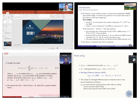 特聘教授洪永淼做了与金融计量经济学相关的题为“Can interval data Improve Volatlity forecasts? Evidence from Foregin Exchange Markets”的主旨演讲,清华大学经济管理学院讲席教授苏良军做了与面板数据中交互式固定效应相关的题为“Profile GMM Estimation of Panel Data Models with Interactive Fixed Effects”的主旨演讲,中国科学院张新雨研究员做了与模型选择和模型平均相关的题为“From Model Selection to Model Averaging: A Comparison Studies for Nested Linear Models”的报告,西南财经大学数据科学与商业智能联合实验室执行主任常晋源教授做了如何检验高维鞅差的题为“Testing the martingale difference hypothesis in high dimension”的报告。