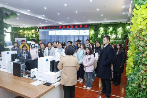在兰丁股份工作人员的带领下,同学们参观了公司宣传展厅、生产线、新技术和产品展示区等区域。通过参观,同学们初步了解了兰丁股份的核心业务和技术创新等方面的情况,对人工智能在医疗领域的应用有了一定了解。