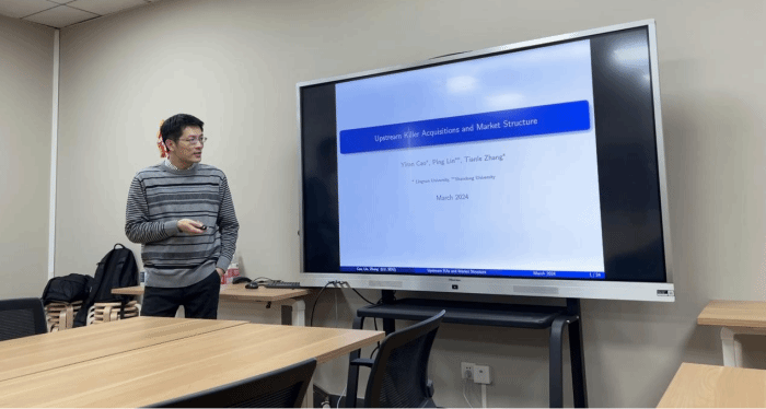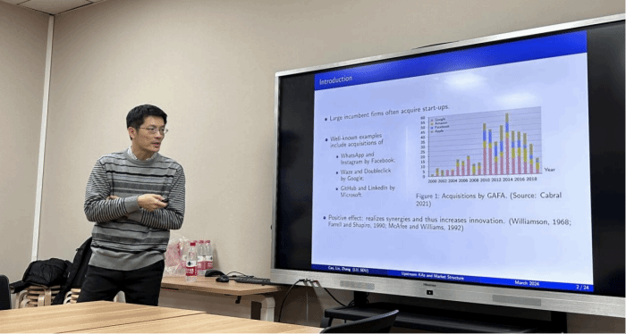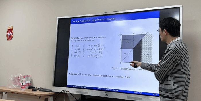 随后,张天乐教授详细介绍了研究的模型设定,包括上游的一个垄断企业和一个具有领先技术的初创企业以及下游的n个企业,并规定了上游企业各自的生产成本、创新成本和成功创新的概率。张天乐教授根据上游垄断企业是否收购了某一下游企业,将其分为垂直分离和垂直整合两种情况,并通过逆向归纳法求解出在各自情况下四种可能的均衡结果所对应的条件以及社会福利的情况,阐述了并不是所有掠夺性收购都会带来福利损失的原因。