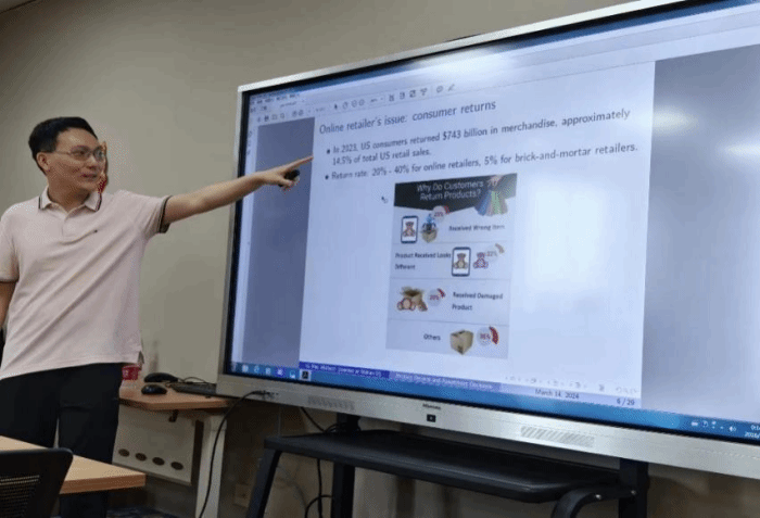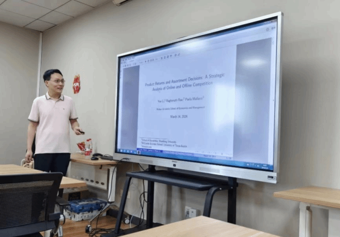 首先,李越老师向大家介绍了研究动机及相关文献。近年来,电子商务蓬勃发展,给予了实体店极大冲击。然而,由于产品质量、宣传及发货等方面问题,其退货率居高不下。为节省退货成本,线上零售商开始寻求与线下零售商的合作,允许通过网店购买产品的顾客直接在实体店进行退货。此类合作改变了线上、线下零售商产品销售决策。近期已有文献讨论网店与实体店的竞争、合作及多产品销售等问题,但暂无文献对以上问题进行综合探讨。