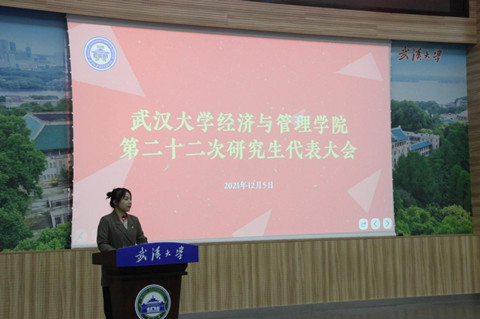 研究生会代表徐高铮同学发言。徐高铮同学代表校研究生会和各兄弟培养单位研究生会向大会的顺利召开致以热烈祝贺,肯定了经管院研究生会过去一年中各方面的成绩,并就研究生会如何在新时代展现新气象、实现新作为分享了自己的学习感悟。