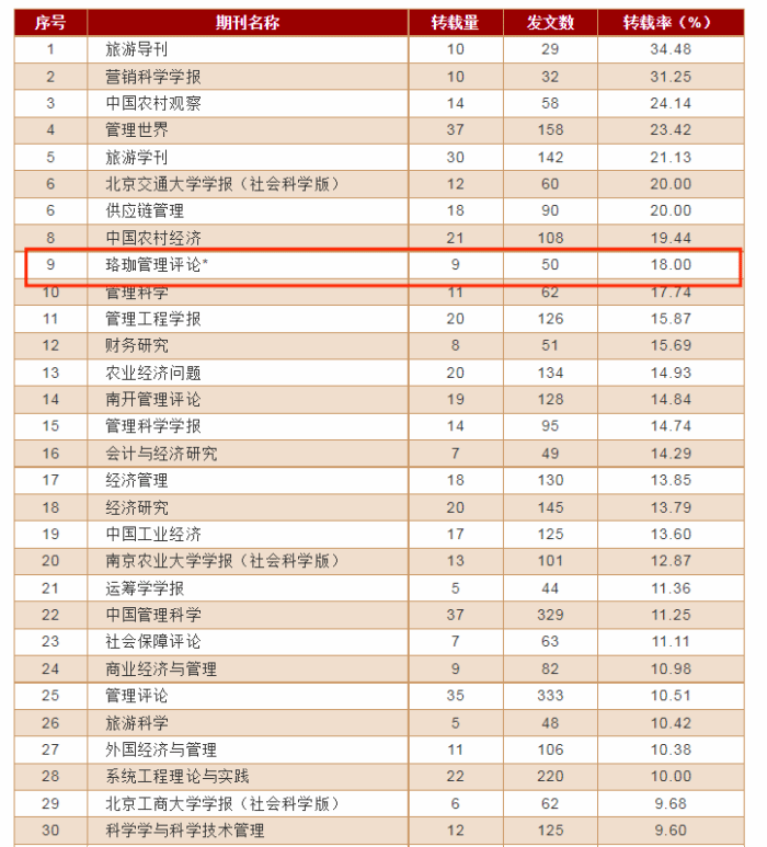 工商管理学科涉及全文被转载的期刊数量为183种,进入转载量表的期(集)刊共30种。在30种入选刊中,《珞珈管理评论》作为唯一入选的集刊,转载率为18%,位列第4名(如表1所示);综合指数为0.539853,位列第11名(如表2所示)。