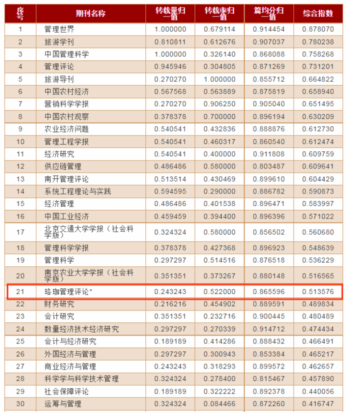 《珞珈管理评论》同时进入了管理学学科的50种期(集)刊转载量表,选自361种期(集)涉及全文被转载的管理学期(集)刊,《珞珈管理评论》作为转载量表唯一入选集刊,全文转载率位列第9位(如表3所示);综合指位列第21名(如表4所示)。