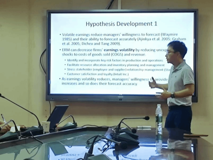 首先,徐健人老师对管理层盈利预测和企业风险管理(ERM)进行了概念阐述,强调了管理层盈利预测对于企业经营的重要性及应用背景应用,随之引出了该文章的主要研究问题:ERM作为一项强调整体风险监督和战略规划的机制,那么ERM的采用是否影响以及如何影响管理层的收益预测。