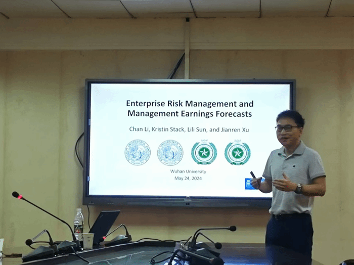 419成功举办。本次论坛邀请到了美国北德克萨斯大学徐健人副教授(终身教授)进行题目为“Enterprise Risk Management and Management Earnings Forecasts”的学术报告,论坛由保险与精算系主任王正文副教授主持,保险与精算系研究生与本科生共20多位学生参加讲座。