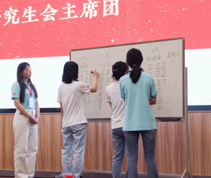 第二十四届研究生会执行主席柳婧舒同学带领各位代表听取并审议研究生会主席团、大会常任代表委员选举办法。大会筹备委员会资格审查委员会负责人高镁桦作研究生会主席团候选人、大会常任代表委员候选人资格审查报告。参会代表共同审议通过主席团候选人,常任代表委员候选人和大会选举总监票人、监票人、计票人名单。大会总监票人葛彦池同学主持选举计票环节,四名研究生会主席团候选人分别上台竞选演讲并就研究生会工作的有关问题进行现场作答。
