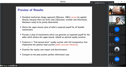 最后,徐欣毅老师从建立一个模型入手,强调了模型中竞标者的异质性和卖方潜在的道德风险,并且假定卖方期望回报最大化。在模型构建之后,徐老师具体说明了在royalty auction中,卖方承诺的三条原则:allocation rule, transfer rule和information disclosure rule。然后引入了trustworthy mediator并说明其作用。在模型分析中,聚焦于不失一般性的direct mechanism.经过详细的分析过程,最终得出了最优的royalty auction并得出了卖方回报的最大值。