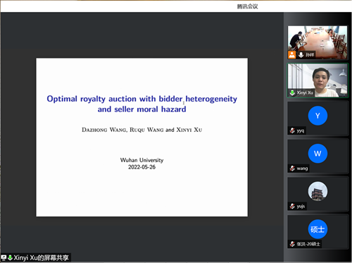 5月26日下午,经济学高级研究论坛第185期在线举行。本次讲座由数理经济与数理金融系韩立宁老师主持,邀请中山大学徐欣毅老师带来主题为“Optimal royalty auction with bidder heterogeneity and seller moral hazard”的学术报告。AV淘宝