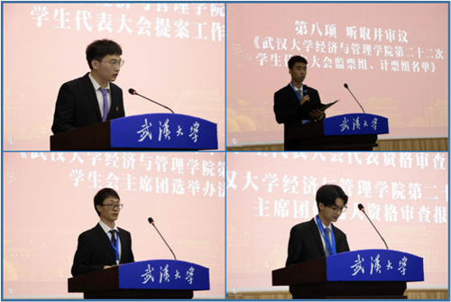 之后进行主席团候选人竞选环节,包括候选人演讲、答辩等部分。候选人吴雨欣、陈炳一、王子怡、万禾、吴科锦、王宇弛、张紫逸分别从自身学生组织工作的经历出发向各位代表分享个人感悟,充分展现了他们的个人风采。