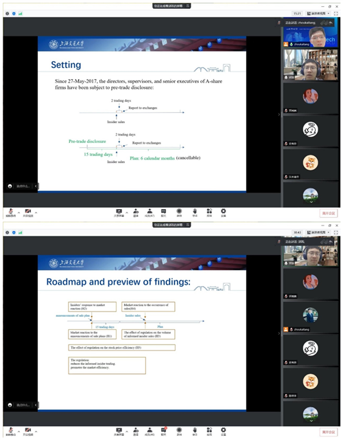 随后,郭凯老师分别从Motivation、Setting、Contribution、Roadmap and preview of findings、Hypothesis、Results、Conclusion等方面展开了详细清楚的讲解。在Setting部分,师生们对2017年颁布的减持新规的具体规定以及实施细节表现出了浓厚的兴趣,并与郭老师进行了热烈的讨论。在Roadmap and preview of findings和Hypothesis环节,很多老师和学生都结合自身担任独董或者实习实践的经历与郭老师探讨了董监高减持背后的真正原因,其中,针对股权激励行权期间的减持到底有没有信息含量以及如何将有信息含量和没有信息含量的减持行为进行区分等问题展开了激烈的讨论。