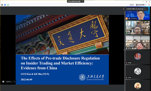 会计系助理教授郭凯老师带来主题为“The Effect of Pre-trade Disclosure Regulation on Insider Trading and Stock Market Efficiency”的学术报告。学院谢获宝、周楷唐、廖珂、李晓蹊等多位师生参加论坛。