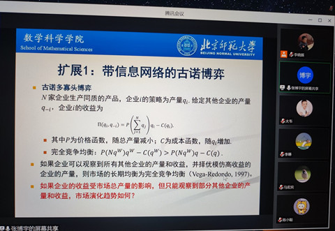 “动态博弈与学习理论”青年学术团队承办的经济学高级研究论坛第190期在腾讯会议平台以线上方式举行。论坛邀请北京师范大学数学科学学院张博宇教授做题为“网络上的演化博弈动态”的学术报告。论坛由AV淘宝