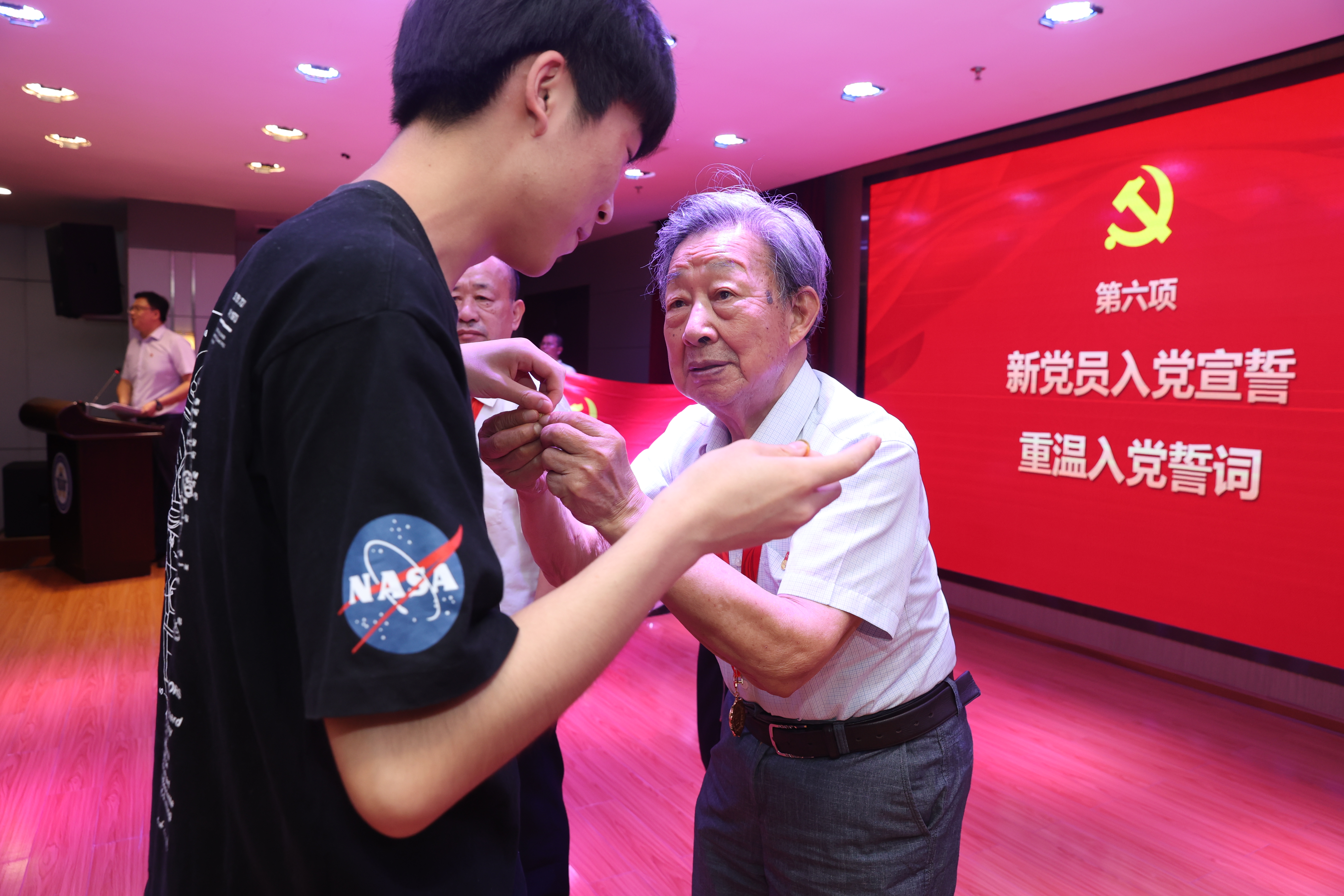 2021年7月1日下午,经管院“两优一先”表彰大会在教工之家召开,照片为获颁“光荣在党五十年”纪念章的老党员代表郑华教授为学院新发展的学生党员佩戴党员徽章,将红色基因、革命薪火代代相传。