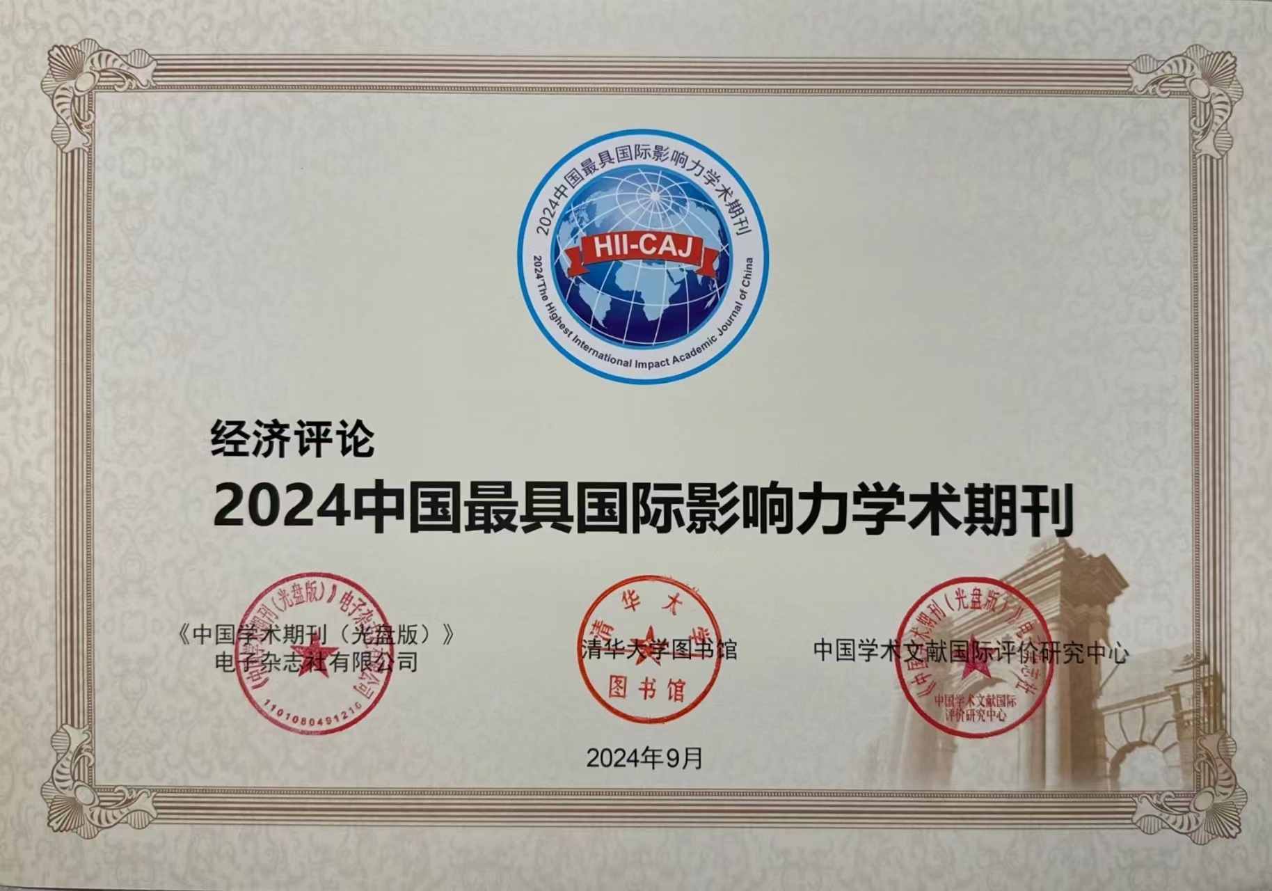12月24日,《中国学术期刊国际引证年报》(2024版)在2024年度知网学术影响力评价系列报告发布会上正式发布,《经济评论》获评“2024中国最具国际影响力学术期刊”(人文社会科学•中文)。