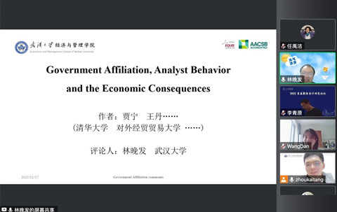会计系承办的蓝月亮珞珈会计论坛第100期通过线上的方式举行。论坛邀请了对外经贸大学王丹老师做题为“Government Affiliation, Analyst Behavior and the Economic Consequences”的学术论文报告。论坛由会计系周楷唐老师主持,李青原、潘红波、林晚发等多位老师和学生参加了此次论坛。