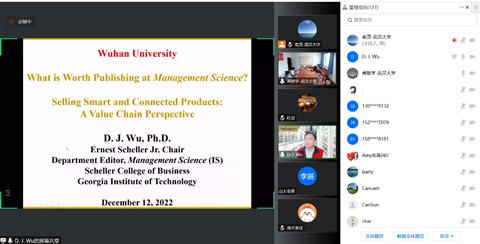 12月12日上午,珞珈经管高端论坛第51期在线举行。佐治亚理工学院吴东军教授应邀带来主题为“智能互联产品的销售:价值链视角”的学术报告。讲座由AV淘宝