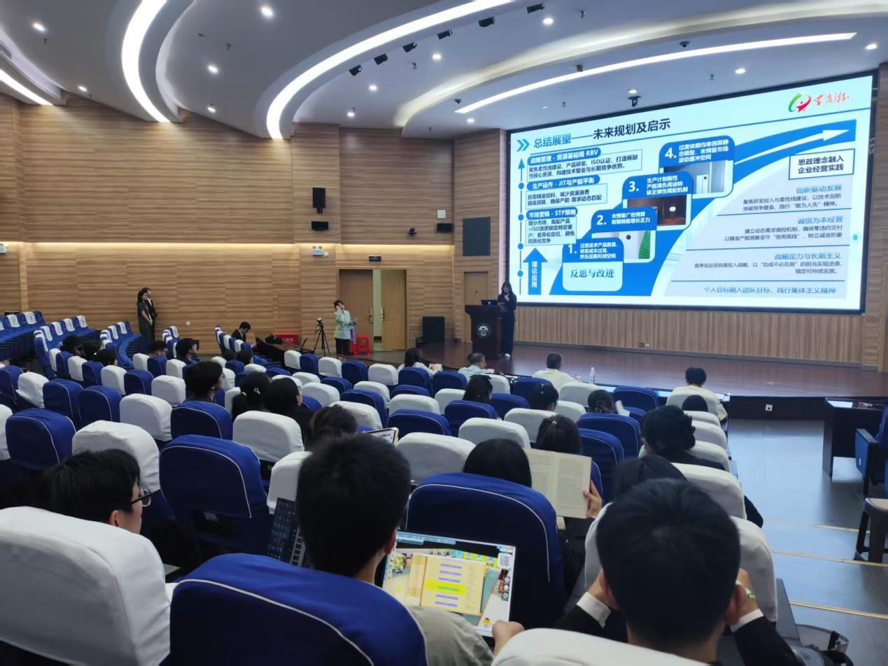 的张芷窈和来自电气学院的杨源朝。团队以全视角路演PPT深度解析初赛方案,从战略规划、经营详情、实战复盘、未来展望四大维度展开专业展示。战略层面,团队秉持“战略前置,厚积薄发”理念,构建覆盖多元场景的全场景空气净化解决方案,依托学科交叉优势实现专业分工协同。经营规划聚焦市场开发、产品矩阵、供应链优化及财务杠杆策略,通过对标行业标杆构建差异化竞争路径。实战复盘环节,团队详解四阶段经营策略,展现从首季垫底到最终登顶的逆袭路径。总结展望阶段,团队基于SWOT分析明确发展路径,提出运用STP理论细分市场、JIT模式优化产能,深度融入“创新驱动”思政理念,未来将持续完善战略布局。答辩环节中,团队成员针对评委提问逻辑清晰、专业精准作答,全面覆盖问题核心,以扎实的专业功底与对比赛的深度理解,彰显出色的临场应变能力与团队协作素养。