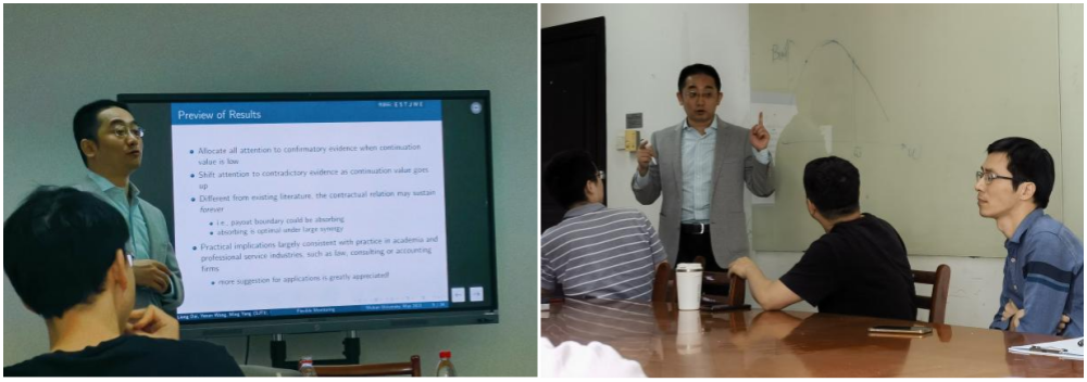 的戴亮副教授带来了主题为“Dynamic Contracting with Flexible Monitoring灵活监控的动态合同”的学术报告。
