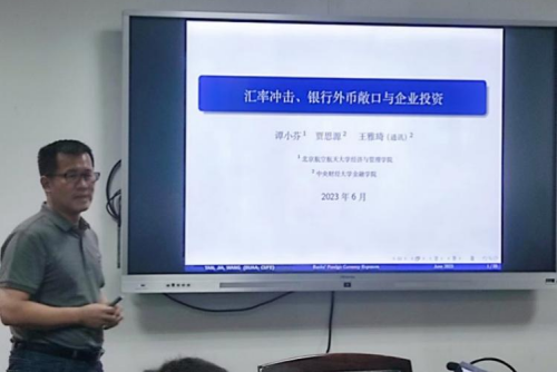 谭小芬老师展示了其研究“汇率贬值冲击、银行外币敞口与企业投资”。在我国金融开放进程不断加快、资本项目开放程度显著提升的背景下,谭小芬老师点明,汇率贬值冲击可以通过银行外币敞口影响国内信贷市场,并进一步通过银行和企业之间的资金联系传导至实体经济。研究发现,汇率贬值冲击后,相比于外币敞口较低的银行,外币净负债水平更高的银行贷款规模下降更为显著;对于企业而言,从外币负债水平较高的银行借款更多的企业,在汇率冲击后的投资支出显著下降。