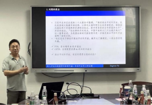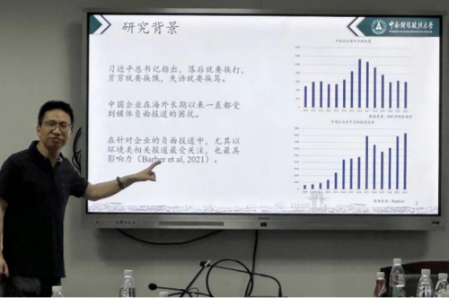 陈思翀老师报告的题目是“从‘以商促投’到‘负责任投资’:环境负面报道下的中国企业海外并购”。研究讨论了“以商促投”和“负责任投资”能否有利于中国企业构建海外并购的合法性及其具体原因。陈思翀老师指出,负责任投资有助于构建中国企业的国际竞争新优势,使中国企业更有效应对环境负面报道对其海外并购带来的负面影响。
