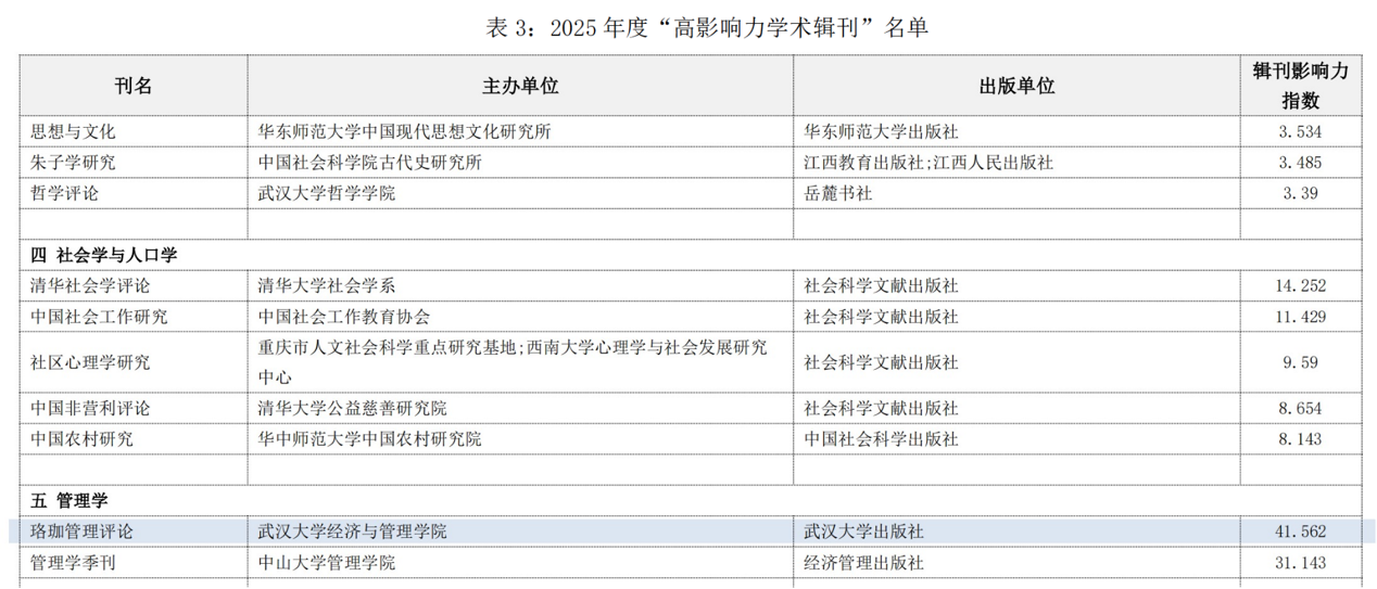 报告限定评价范围为社科辑刊,对691种参评辑刊按学科计算“辑刊影响力指数”并排序;在定量结果基础上结合定性评估,从学科内排名前25%(Q1)的辑刊中遴选出191种为2025年度“高影响力学术辑刊”。《珞珈管理评论》在此名单中以41.52再次位居首位。