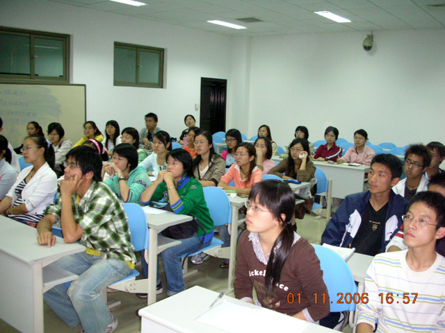 随后,在曾院长的陪同下,Stephen Murdoch先生来到B129教室分别与2005级中法金融班和中法工商管理班的学生,以及今年报名选拔2006级中法金融班和中法工商管理班的部分学生见面。Stephen Murdoch先生向在坐的学生详细介绍了此项目的主要情况,并回答了学生诸如学费、签证、考试要求等感兴趣的问题。(科研外事与学科建设办公室供稿)