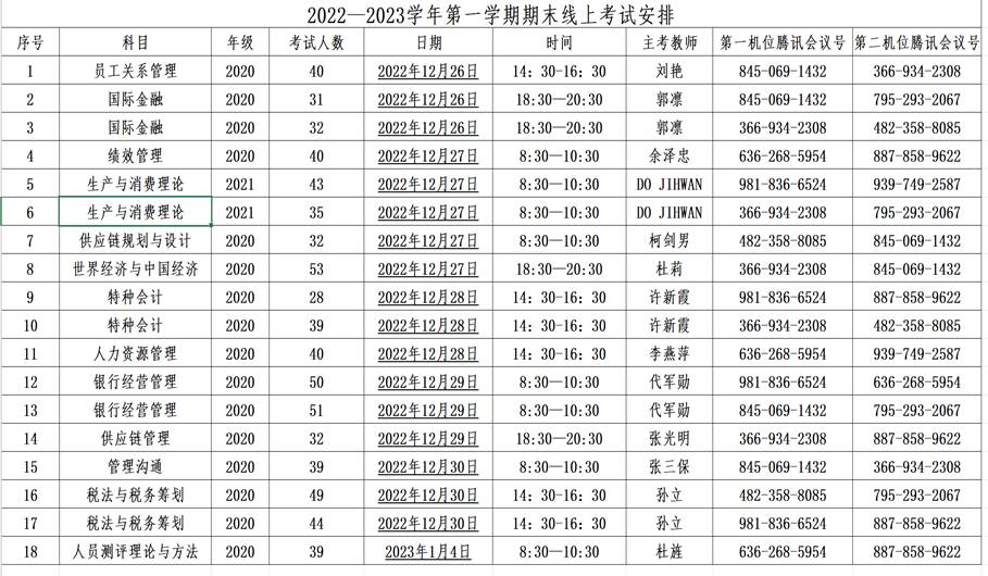 本学期期末考试周为第17-18周(2022年12月25日至2023年1月7日)。学院本学期13门专业课程进行线上考试,具体课程和安排如下: