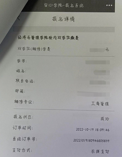 辅修学士学位群(629060156)填写在线文档确认缴费信息。