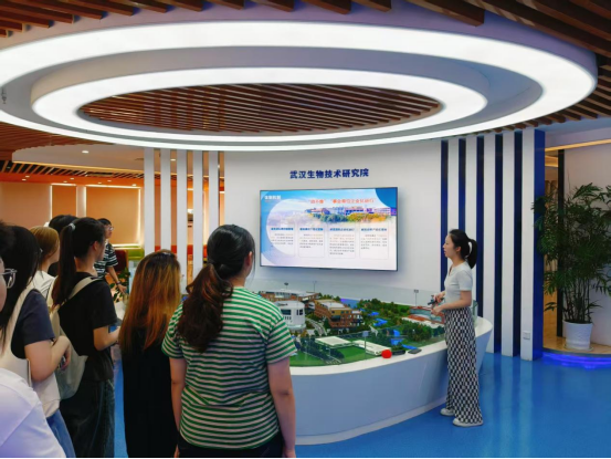 在武汉生物技术研究院(以下简称“研究院”),师生们得以一窥区域生物科技创新的策源力量。研究院工作人员介绍了其作为开放型研发大平台的定位——由湖北省、武汉市、东湖高新区三级政府共建,旨在打造技术创新的沃土、成果转化的摇篮和高层次人才的磁石。